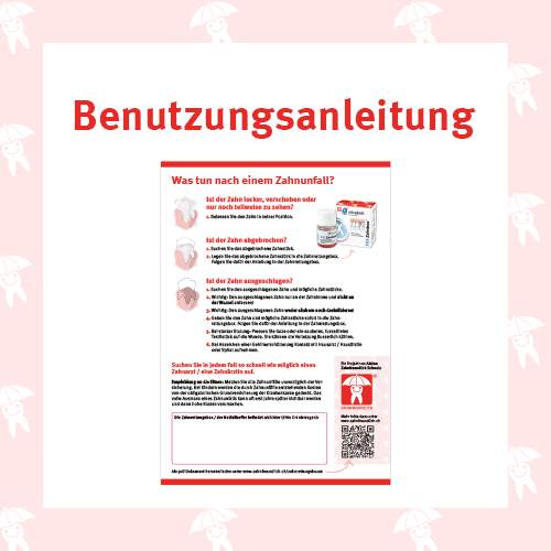 Die Zahnrettungsboxen befinden sich im Erste-Hilfe-Kasten von Schulen. Im Notfall wird der Zahn – ohne ihn an der Wurzel oder Bruchstelle anzufassen – in die Lösung gelegt, die Box verschlossen und mit zum Zahnarzt genommen. Die Anwendung ist einfach und in wenigen Schritten erklärt – ideal für Lehrpersonen, Betreuungsteams und selbst Kinder.